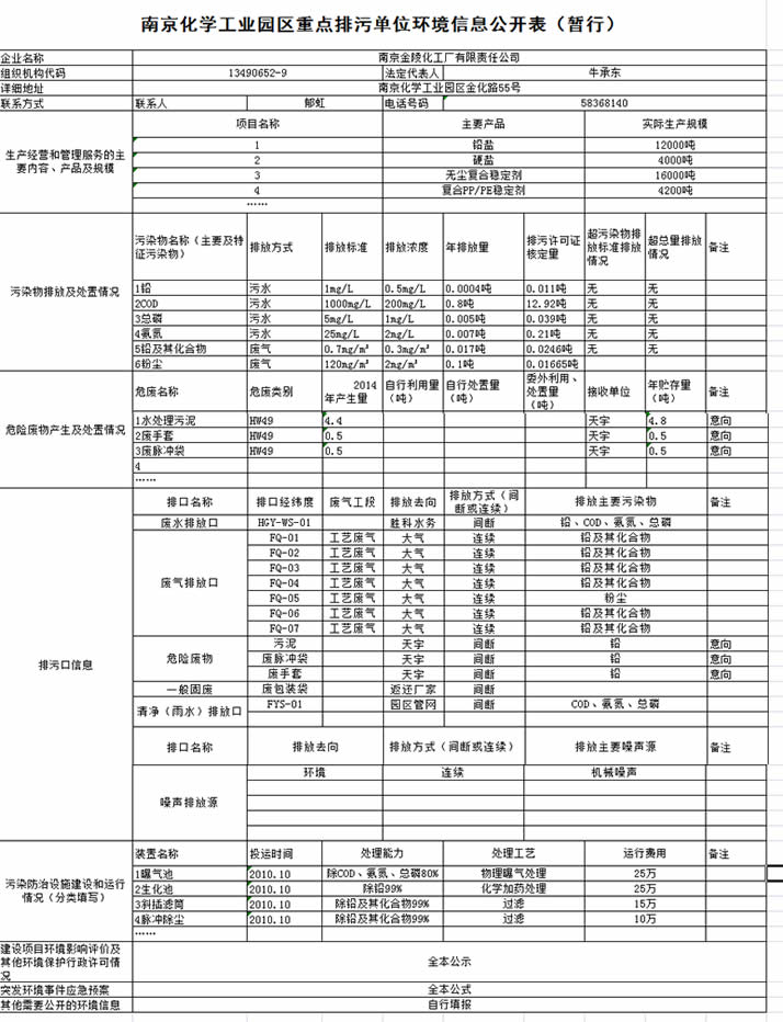 南京化學(xué)工業(yè)園區(qū)重點排污單位環(huán)境信息公開表(暫行)